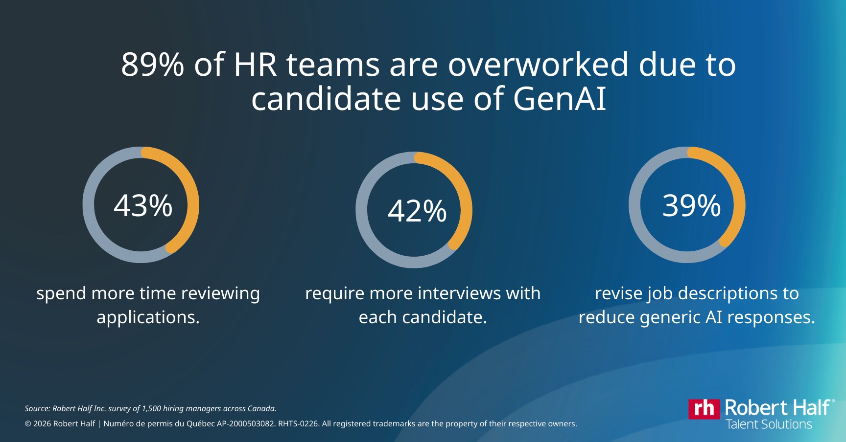 89% of HR teams are overworked due to candidate use of GenAI. 43% spend more time reviewing applications. 42% require more interviews with each candidate. 39% revise job descriptions to reduce generic AI responses. Source: Robert Half survey of more than 1,500 hiring managers in Canada. © 2026 Robert Half Canada | Numéro de permis du Québec AP-2000503. /p>